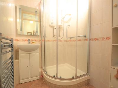 Solid wood painted door, corner shower enclosure with sliding glass doors and Mira 'Sport' electric shower, white vanity unit with integrated white washbasin and chrome mixer tap, chrome heated towel rail, fully tiled walls, tiled floor, extractor fan, emergency pull-cord, ceiling light fitting, Artex ceiling.