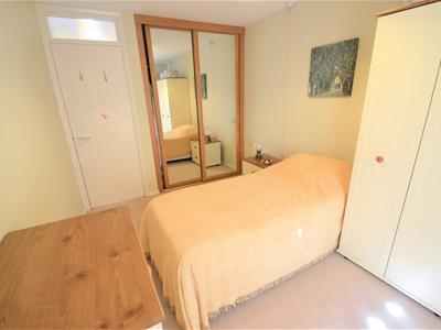 Solid wood painted door, uPVC double glazed window to side, walnut effect veneered fitted wardrobes with sliding mirrored doors and built-in walnut veneered drawer unit with shelving, wall mounted electric heater, emergency pull cord, ceiling light fitting, Artex ceiling, fitted carpet.