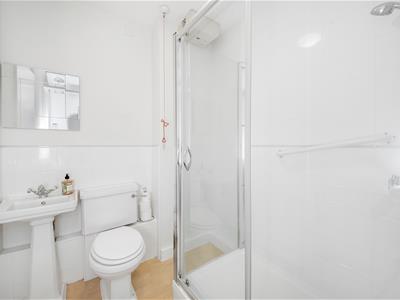 White painted wooden door, airing cupboard housing cold water tank and hot water cylinder, white suite comprising pedestal wash hand basin, low-level WC, enclosed shower cubicle with sliding glass door, and wall mounted chrome shower head with handheld spray attachment, partly tiled walls, heated towel rail, Harmony extractor fan, emergency pull cord, Artex ceiling, vinyl flooring, ceiling light fitting.