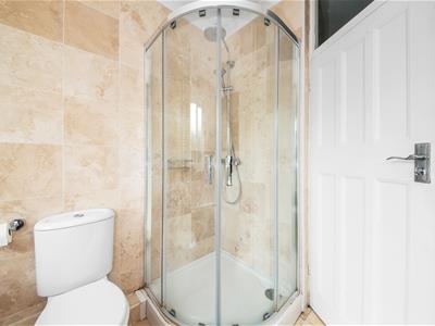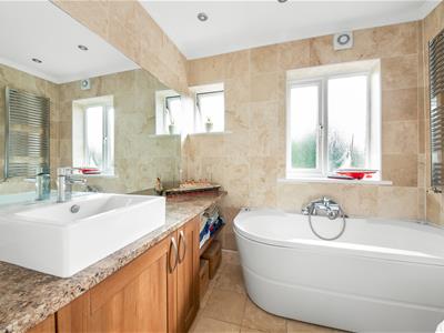 White painted panelled wooden door, two uPVC opaque double glazed windows, whit suite comprising panelled jacuzzi bath with chrome mixer tap with hand-held spray attachment, counter-top white hand wash basin with granite effect laminate worktops with shelving and built-in storage cupboards under, enclosed shower cubicle with rainfall shower and hand-held spray attachment, chrome heated towel rail, Travertine tiled walls and floor, coving, recessed downlights.