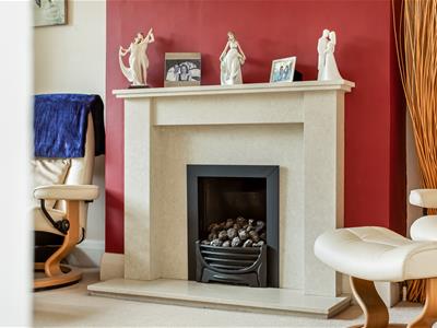 Painted panelled wooden door, uPVC double glazed window to front bay, polished limestone fireplace with 'living flame' gas fire and polished limestone hearth, radiator, television aerial point, telephone point, fitted carpet, ceiling light fitting. Archway through to:-