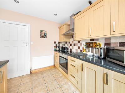 White painted wooden panelled door, uPVC double glazed single door to garden with uPVC window to side, radiator, range of beech wall and base units with granite style laminate worktops, Bosch electric oven, ignis electric hob with extractor hood over, space for fridge freezer, integrated dishwasher, ceramic tiled floor, recessed downlights, serving hatch to dining room.