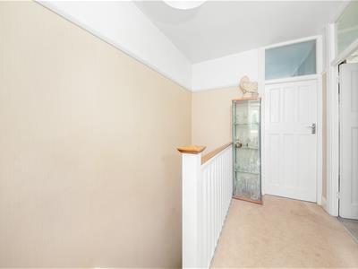 Stained wood panelled door with glazed 4-panel fanlight with leaded stained glass decorative panels above and on either side. double radiator, picture rail, built in coats cupboard, understairs cupboard housing smart meter and fuseboard, thermostat control point, ceiling light fitting, fitted carpet. Stairs to first floor.