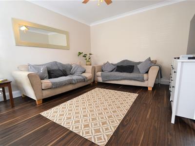 4.32m x 3.58m (14'2 x 11'9)White painted panelled door, wood effect LVT flooring, cream emulsion painted walls with coving, two double glazed windows with fitted shutters, light fitting with ceiling fan.