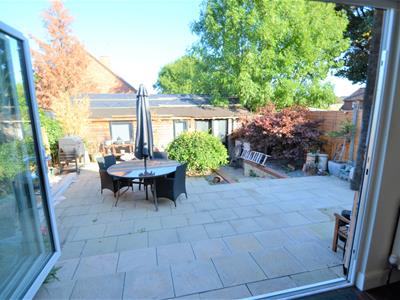 The property comprises spacious entrance hall, neutrally decorated family formal lounge to front with shutters, a beautiful neutral high gloss kitchen suite with integrated dishwasher, built in high level oven and microwave, and spaces for appliances including a recess for American style fridge freezer (there is also a utility room for washing appliances and further refrigeration). The kitchen suite is open to a large dining area and further family area with double glazed French doors opening to a secluded decked patio area to side, and beautiful bi-folding doors opening wide to the rear garden. There is also a recently constructed shower room to the ground floor and a garage/store to the side of the house accessed via wooden gates to the front.