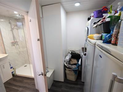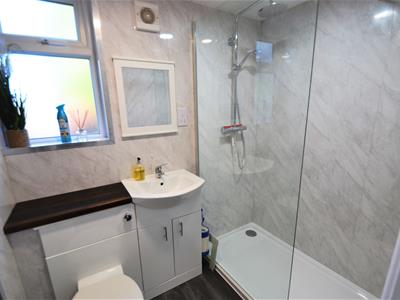 2.06m x 1.47m (6'9 x 4'10)White painted door, wood effect LVT flooring, vanity unit with mounted wash basin and concealed cistern WC, large walk-in shower enclosure with tall glass panel, marble effect wall panels, double glazed window, chrome heated bathroom towel rail.