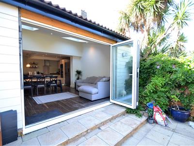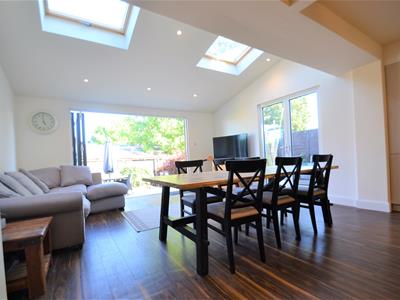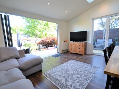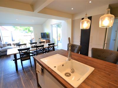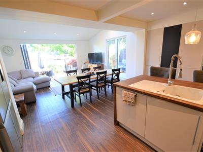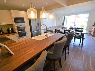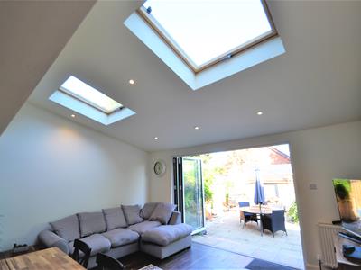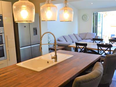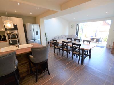 7.44m x 4.93m (24'5 x 16'2)Wood effect LVT flooring, cream emulsion painted walls, neutral high gloss modern fitted kitchen suite with solid wood counter tops, electric hob with stainless steel extractor hood, high level double oven, high level integrated microwave, integrated dishwasher, recess for american fridge freezer, lots of storage, rear extension with sloping ceiling and two large velux windows, double glazed side French doors leading to decked side enclosure and bi-folding doors to the rear opening onto the garden.