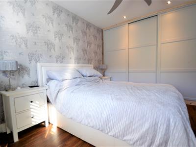 4.39m mac x 2.97m (14'5 mac x 9'9)Solid wood panelled door, wood effect flooring, grey emulsion painted walls, coving, double glazed window with shutters, built in wardrobes with sliding doors, ceiling light fitting, radiator.