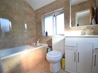 2.31m x 1.65m (7'7 x 5'5)Solid wood panelled door, neutral colour stone effect ceramic wall and floor tiles, large white gloss vanity unit with top mounted wash basin and concealed cistern WC, white bath with shower over and glass shower screen, chrome heated towel rail, ceiling light fitting, two double glazed windows.