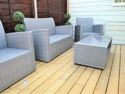 To the rear is a predominantly paved rear garden, with an enclosed decked recess accessed from the open plan living room French doors, fenced boundaries, planting areas, steps down to a large timber summer house which has power, lighting and heat, is current divided into 2 rooms but can be made fully open plan if required.