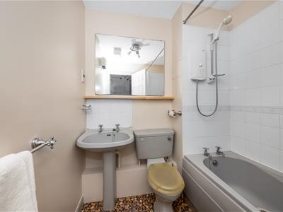 White panelled door, grey bathroom suite comprising panelled bath with Mira electric shower, pedestal wash hand basin, shaver point, low-level WC, Artex ceiling, ceiling light fitting, vinyl flooring, wall mounted electric heater.