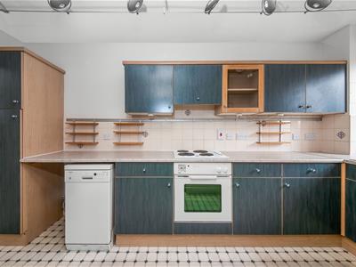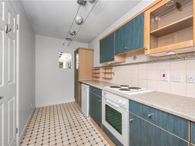 White panelled door, window to front, range of blue/grey flat front wall and base units with beech trim and laminated worktops, stainless steel sink and drainer, Zanussi 4 ring electric hob, Zanussi extractor hood, Zanussi oven, space for washing machine, space and plumbing for dishwasher, space for fridge/freezer, tiled splashbacks, Artex ceiling, ceiling light fitting, vinyl flooring.