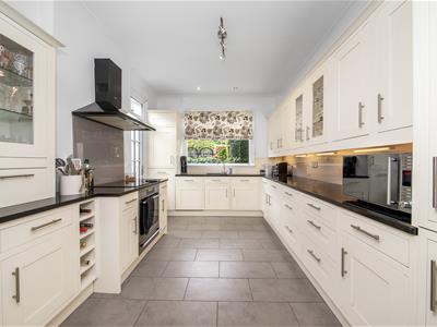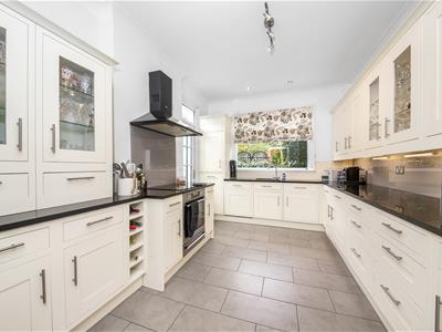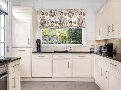 Grey tiled flooring, cream colour Shaker style kitchen suite with black granite worktops, built in low level oven and electric hob, integrated fridge freezer, integrated dishwasher, integrated washing machine and integrated tumble dryer, boiler cupboard and an integrated recycling store cupboard, window to rear overlooking garden and double glazed door to garden, modern upright wall radiator,