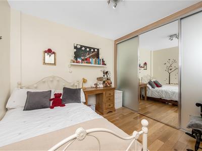 Solid wood painted door, wood flooring, neutral emulsion painted walls, large built in wardrobes with sliding doors, double glazed window, ceiling light fitting, radiator.