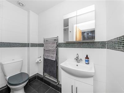Grey tiled floor, white wall tile with mosaic border, chrome heated towel rail, cream gloss vanity unit with top mounted wash basin, WC, large shower enclosure with sliding glass door entry, WC, extractor fan, double glazed window.