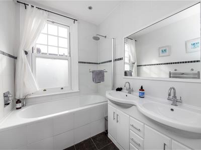 Grey tiled floor, large built in vanity unit with double wash basin, white double ended bath with shower over, glass shower screen, wall integrated shower controls and shower outlet, chrome heated towel rail, spot lights, double glazed sash window.