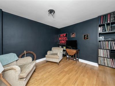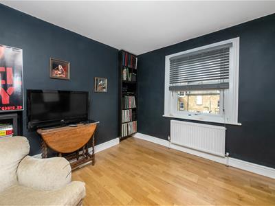 Painted solid wood panelled door, exposed and varnished floor boards, grey emulsion painted walls, cast iron and tiled insert fireplace with decorative wooden fireplace surround, two UPVC double glazed sash windows, picture rail and coving, radiator in decorative wooden boxing, ceiling light fitting.