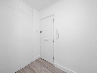 Wooden front door, storage cupboard housing fuse box, coats cupboard, entryphone, grey limed oak effect laminate flooring, two ceiling light fittings.