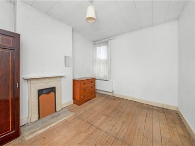 Painted wooden door, white uPVC double-glazed window to rear, painted cast iron fireplace surround, polystyrene tiled ceiling, ceiling light fitting, exposed floorboards.