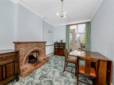 Internally, the property comprises a cosy entrance hall, a spacious living room with attractive bay window and fireplace, a dining room with an original, exquisite 'Arts and Crafts' style brick fireplace, a conservatory leading off the dining room, and a kitchen with access to the garden. Upstairs is a galleried landing with three double bedrooms, all featuring original fireplaces, and a family bathroom.