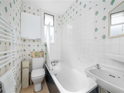Painted wooden door, opaque louvred window, white suite comprising panelled bath with mixer tap and handheld shower attachment, low-level WC, wall mounted wash hand basin, white heated towel rail, part tiled/part papered walls, fitted cupboard, linoleum flooring, ceiling light fitting, hatch to roof space (unboarded).