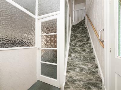 White aluminium double-glazed door, original part opaque glazed painted front door, white painted panelled door to side passageway (leading to conservatory) wood style veneered walls, high level side window, ceiling light fitting, coir matting.