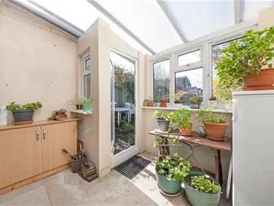 White uPVC double-glazed door to garden, white uPVC double-glazed window to rear, original wooden door to side passage (with light, power and concrete floor leading to front entrance porch), fitted cupboard, concrete floor, polycarbonate roof.