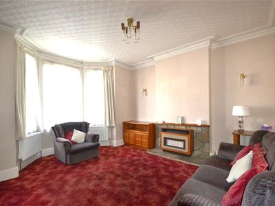 Painted wooden door, white aluminium double-glazed bay windows, painted decorative wrought iron fireplace surround with Art Deco style tiled inset, ceiling light fitting, textured paper ceiling, plaster cornicing, fitted carpet.