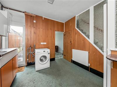 White uPVC double-glazed door to garden, opaque window to side, range of wall and base units with wood style laminate worktops with matching splashbacks, stainless steel sink and drainer with mixer tap, space and plumbing for washing machine, space for fridge and freezer, breakfast bar, Worcester combination boiler, gas point, double radiator, understairs cupboard housing electric meter, fuse board and light, textured papered ceiling, fluorescent strip light, opaque glazed panelled door to dining room, glazed panelled door to entrance hall, glazed panelled wall.