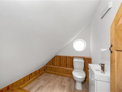 Solid wood panelled door, limited head room due to sloping ceiling, WC, modern white vanity sink unit, port hold UPVC double glazed window to front, wall light.