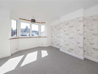 Solid wood panelled door, new grey carpet, white emulsion painted walls with one wallpapered feature wall, UPVC double glazed bay window, ceiling light fitting, double radiator.