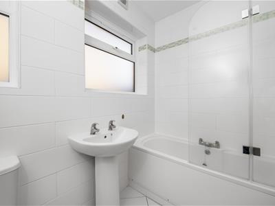 Solid wood panelled door, white floor tiles, white wall tiles, white bath with shower over, including a glass folding shower screen and wall mounted shower unit, pedestal wash basin, WC, two UPVC double glazed windows, chrome heated towel rail.