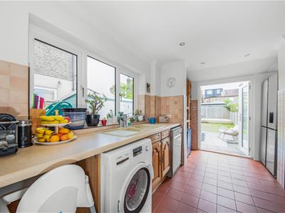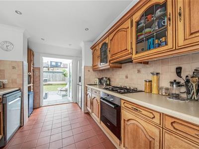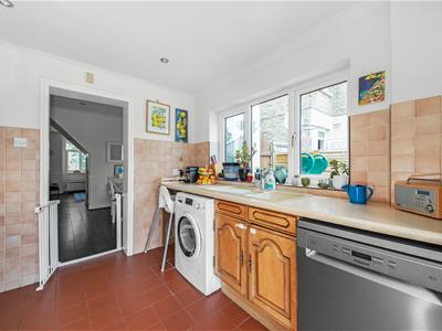 uPVC double glazed french doors opening out to garden with uPVC double glazed window to side, range of antique pine wall and base units with laminate worktops over incorporating cream composite one and a half sink and drainer with chrome mixer tap, 4 ring Ariston gas hob with extractor hood over, Bosch electric oven, space for fridge freezer, cupboard housing Worcester combination boiler, space and plumbing for washing machine, space and plumbing for dishwasher, part tiled walls, terracotta tiled floor, recessed downlights, coving, opening to dining room.