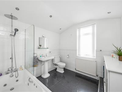 White wooden panelled door, uPVC double glazed opaque window to rear, white suite comprising pedestal wash hand basin with chrome cross head taps, panelled jacuzzi bath with fitted glass shower screen, chrome mixer tap, and wall mounted riser with chrome rainfall shower head and hand-held shower spray, radiator, partly tiled walls, split level tiled floor, recessed down lights.