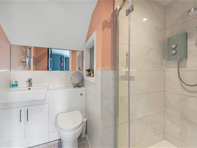 Contemporary black clear glass internal door, white wash hand basin with vanity unit, low level WC with concealed cistern and macerator pump, enclosed glass shower cubicle with Mira 'Azora' power shower, partly tiled marble effect walls, chrome heated towel rail, extractor fan, glass shelved recess, recessed downlights, stone effect luxury vinyl flooring.