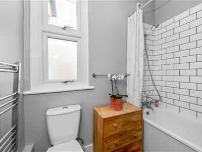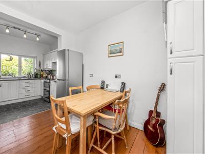 Internally, the property comprises an elegant entrance hall with exposed floorboards, a stylish double reception room with period wrought iron fireplaces and double-glazed sliding sash windows, a spacious kitchen/dining room to the rear. On the first floor a light and airy main bedroom with an en-suite shower room and walk-in wardrobe with fitted shelving, drawers, and hanging rails, two further double bedrooms, all with double glazed sliding sash windows, and a modern family bathroom with shower over bath.