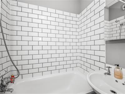 White wooden panelled door, uPVC part opaque double glazed window to side, white suite comprising panelled bath with Victorian style cross head mixer tap with shower attachment, pedestal wash hand basin, low-level WC, part tiled walls, ceiling light fitting, chrome heated towel rail, extractor fan, tiled floor.