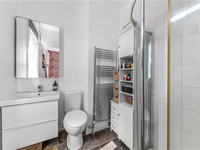 White wooden panelled door, uPVC opaque double-glazed sliding sash window, white suite comprising vanity wash hand basin with mixer tap, low-level WC, enclosed, tiled shower cubicle, chrome heated towel rail, slate tiled floor, recessed down lights, extractor fan.