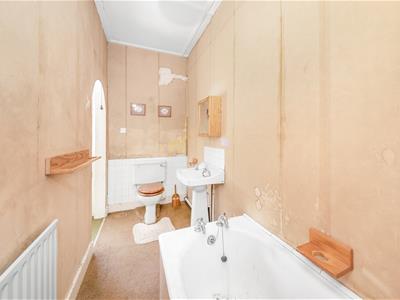 Stripped wooden panelled door, white panelled bath with chrome crosshead taps, grey pedestal wash hand basin with chrome crosshead taps, low-level WC, tiled splashbacks, radiator, ceiling light fitting, panelled ceiling, fitted carpet.