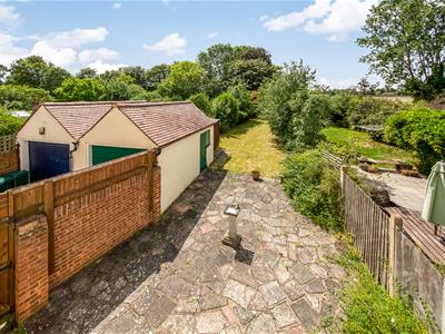 Rear Garden: Paved patio, lawn with mature shrub borders, mature trees, backing playing fields, two sheds, outside tap.