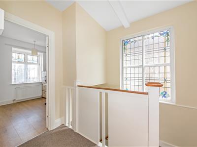 Stained glass window to side with secondary glazing, handrail, hatch to loft, fitted carpet, ceiling light fitting.