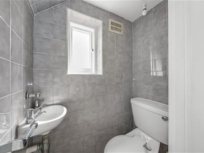 Wooden painted panelled door, white suite comprising low-level WC, wall mounted wash hand basin, tiled walls, tiled floor, air vent, ceiling light fitting