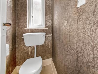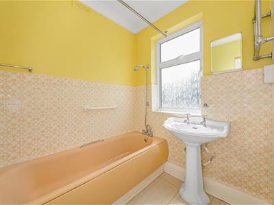 Painted wooden panelled door, opaque white aluminium framed double glazed window to rear, airing cupboard, panelled bath with hand-held shower attachment and mixer tap, pedestal wash hand basin with chrome cross head taps, limestone effect laminate flooring, double radiator, air vent, chrome heated towel rail, part tiled walls, coving, ceiling light fitting.