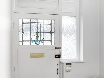 Painted wooden panelled door, white aluminium framed double-glazed window with modern stained glass top lights, built-in cupboard, double radiator, air vent, ceiling light fitting, oak effect laminate flooring.