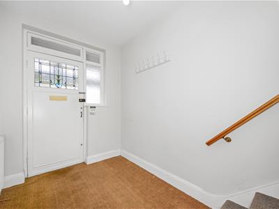Painted wooden panelled front door with stained glass, double radiator, alarm panel, understairs cupboard housing fusebox, gas and electric meters, part coir matting/engineered oak flooring, ceiling light fitting.