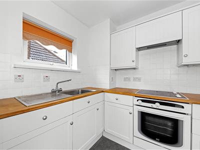 uPVC double-glazed window to side, range of cream 'Shaker' style wall and base units with wooden worktops over incorporating stainless steel sink and drainer with mixer tap, space for fridge/freezer, 'Cordialle' electric oven, 'Creda 900' 4-ring electric hob with extractor hood above, tiled splashbacks, extractor fan, emergency alarm pull cord, Dimplex wall mounted electric heater, fluorescent strip light, textured ceiling, vinyl flooring, opening to Living Room.
