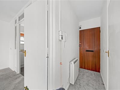 Wooden front door, entryphone, Dimplex electric storage heater, emergency control point, coats cupboard housing electric meter and fusebox, mains operated smoke alarm, ceiling light fitting, textured ceiling, fitted carpet.
