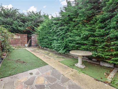 Rear Garden: Artificial lawn with path to rear, paved patio, two garden sheds and fenced boundaries.