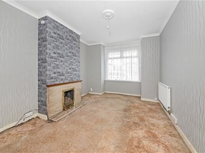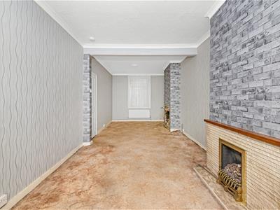Living Room: White panelled door, uPVC double glazed window to front, brick fireplace with gas fire and tiled hearth, radiator, ceiling light fitting with ceiling rose, coving, fitted carpet, opening to:-