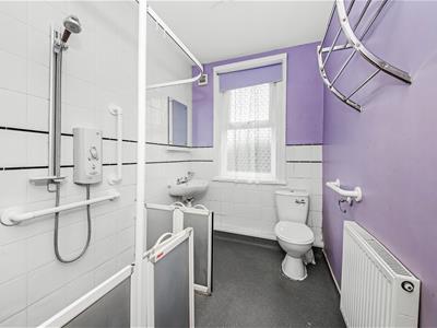 White painted panelled door, uPVC double glazed opaque window to rear, white suite comprising wall mounted wash hand basin with chrome taps, low level WC, Mira Electric shower, radiator, ceiling light fitting, Polyflor safety vinyl flooring,